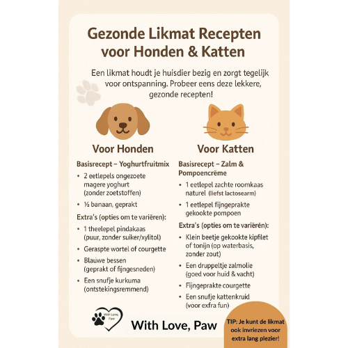- 🐾 Likgedeelte – smeerbare snacks zoals pindakaas, yoghurt of pompoen voor rust en afleiding.